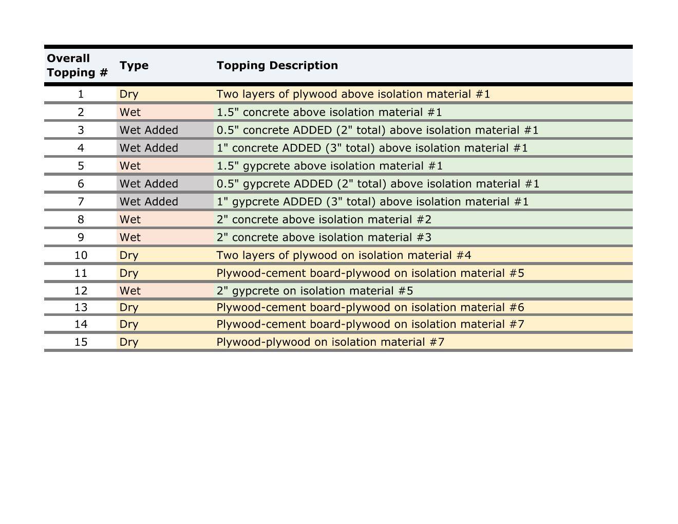 En ce qui concerne les revêtements, la matrice est délibérément vaste. Nous testerons des systèmes coulés (béton et béton au plâtre à plusieurs épaisseurs) et des systèmes secs (contreplaqué, plaques de ciment, matériaux commerciaux), associés à des sous-couches dans une gamme d’épaisseurs et de rigidités dynamiques. Le séquençage est conçu pour que nous permettre de comparer les éléments comparables, et la cure et le séchage seront faits minutieusement pour les données reflètent le comportement que les concepteurs voient après la stabilisation, et non un comportement « premier jour au laboratoire ».