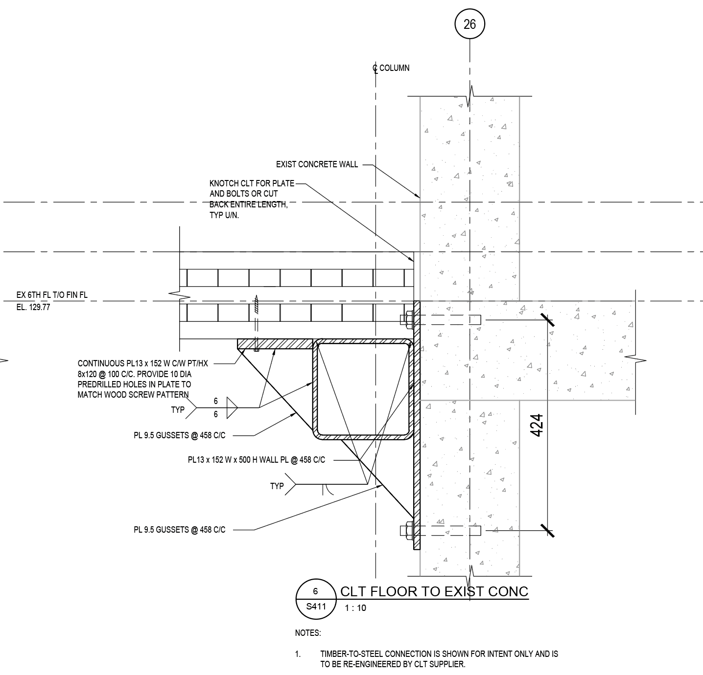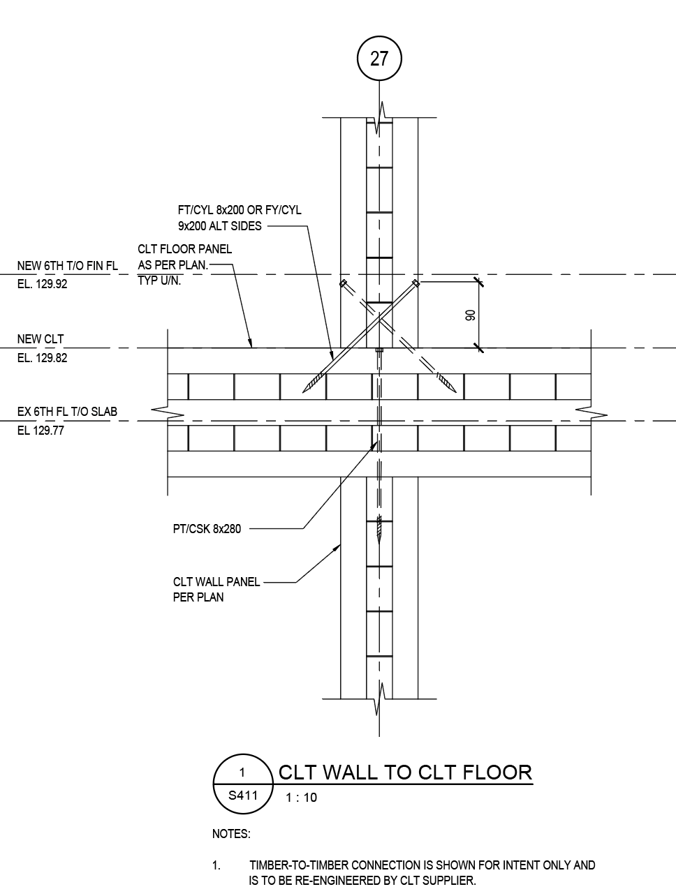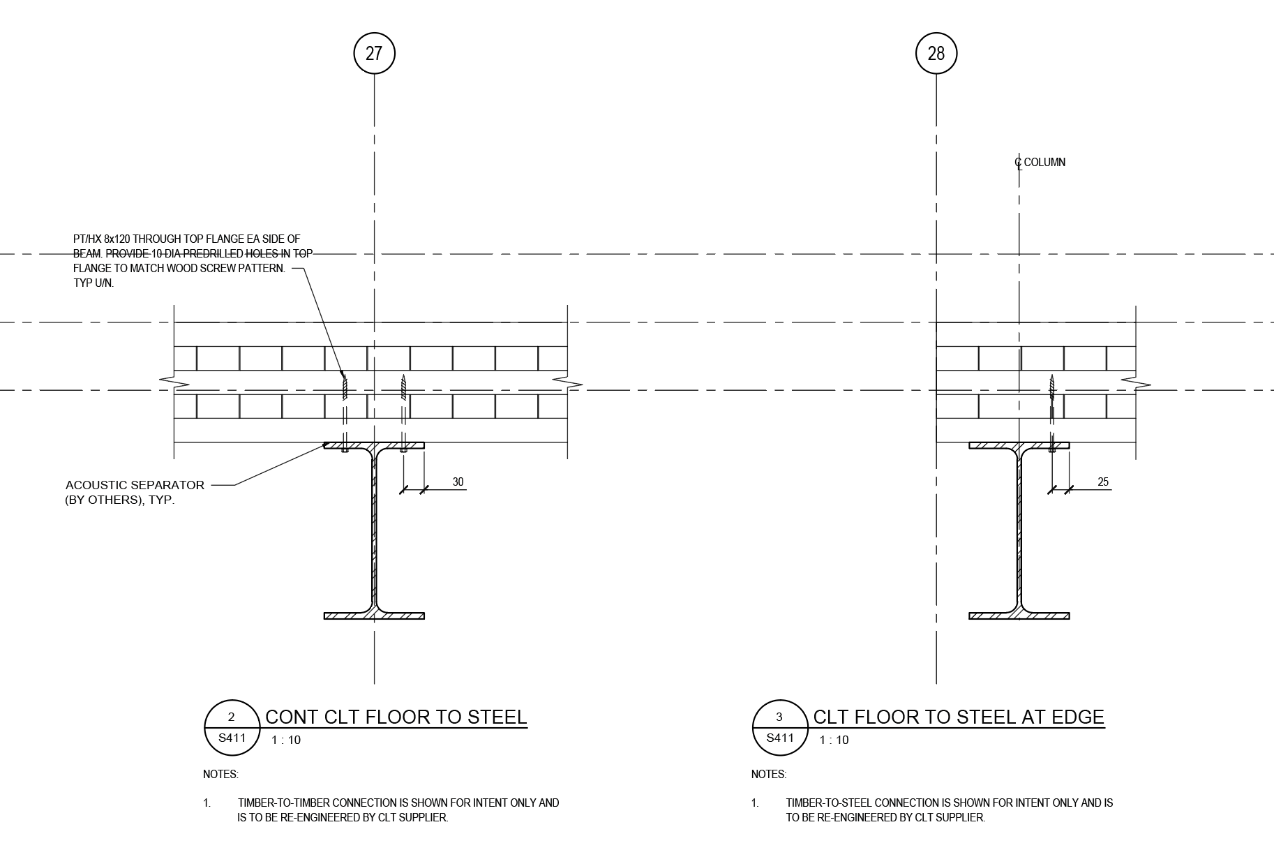 As with all mass timber construction, connection detailing is a critical component of the design, both between adjacent CLT panels and between the CLT panels and the structural steel elements. The following diagram illustrates two CLT-to-steel floor connection details. One for a continuous condition (left) and one at an edge condition (right)
