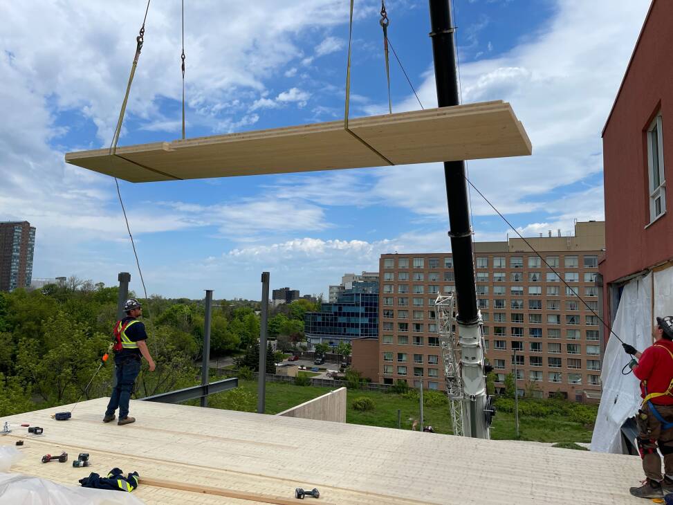 Approvisionnement local durable : fabriqués dans l’usine certifiée par le FSC d’Element5, à St Thomas, les panneaux de bois lamellé-croisé proviennent de bois récolté dans des forêts de l’Ontario gérées durablement, garantissant des pratiques responsables de la forêt à la production.