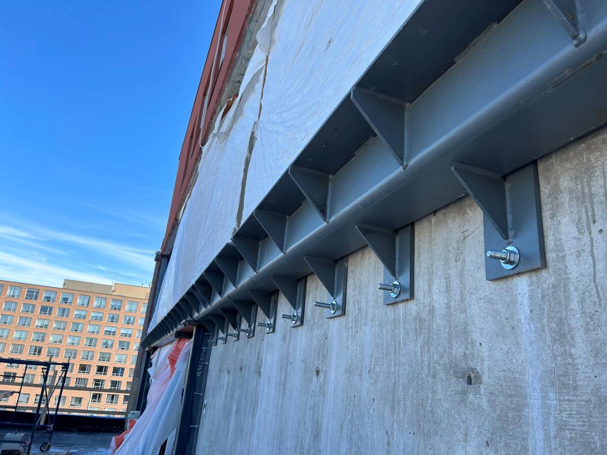 Sur la base de cette analyse, des plaques de calage en acier ont été installées derrière le profilé de charpente creux aux deux étages. Celles-ci ont comblé les écarts entre la lambourde d’acier et le béton irrégulier, assurant un alignement précis et un transfert fiable de la charge vers la structure.
