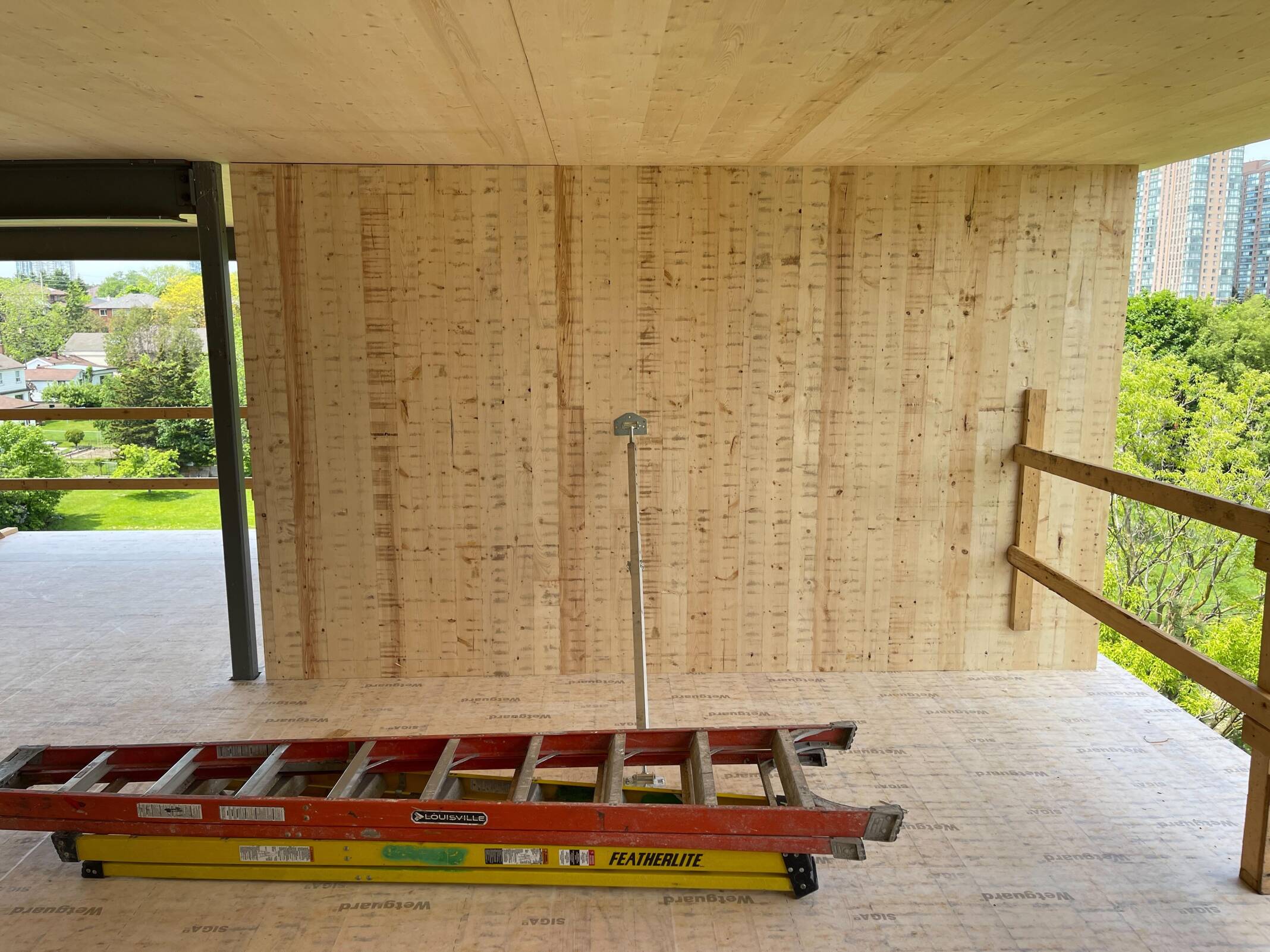 Dans la conception proposée, le plancher et la toiture, ainsi que les murs porteurs intérieurs, sont réalisés en bois lamellé‑croisé, complétés par des poutres et colonnes d’acier assurant le reste du support structurel. Toutefois, l’exigence réglementaire de murs extérieurs non combustibles pour l’octroi du permis de construction a empêché l’utilisation du bois lamellé-croisé pour les murs extérieurs.