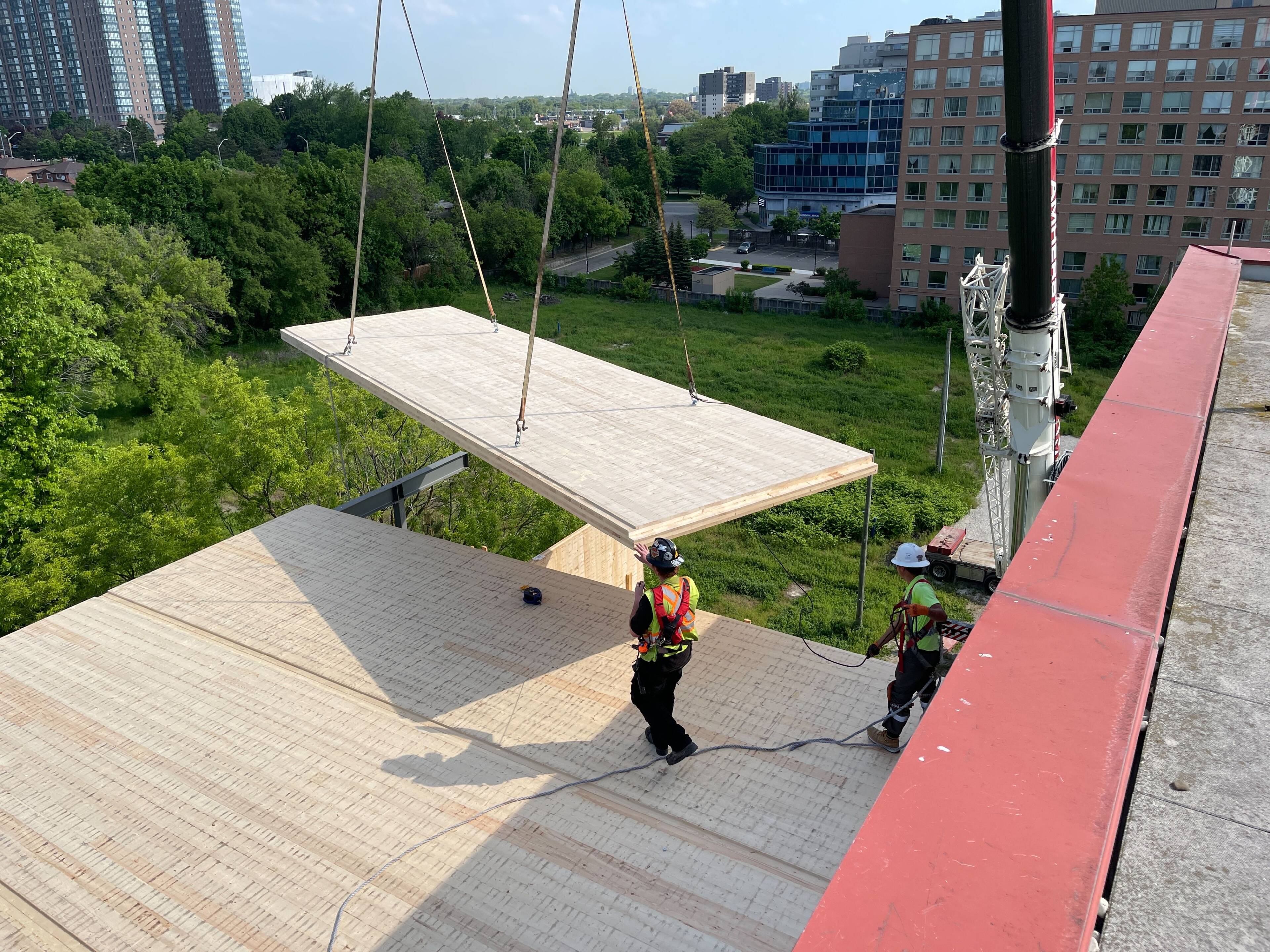 Les panneaux de bois massif ont servi à la construction des murs de contreventement centraux sur les deux étages, ainsi que la toiture et le sixième étage, tandis que des éléments en acier de charpente ont été ajoutés pour satisfaire aux exigences de hauteur libre et de résistance au feu. L’intégration verticale et horizontale de l’extension à la structure existante a posé plusieurs défis, notamment l’installation de gicleurs dans le nouvel espace, en plus des couloirs des cinquième et sixième étages du bâtiment d’origine.