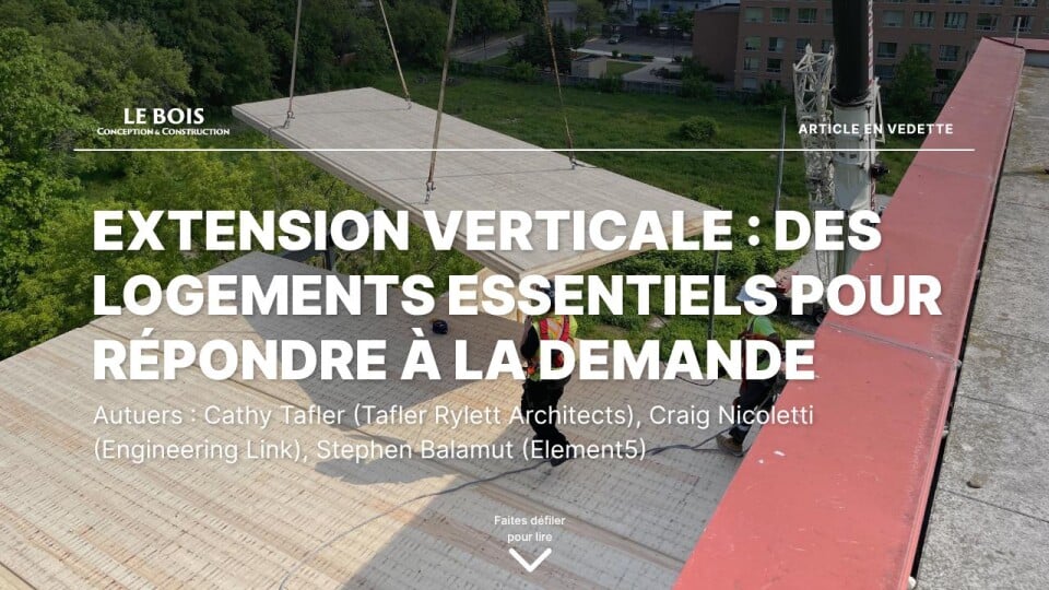 L’agrandissement vertical réalisé par Pathway démontre comment le bois massif peut ouvrir de nouvelles perspectives de logement sur des structures existantes, même face aux contraintes d’immeubles en béton vieillissants. Portée par une analyse minutieuse, une conception harmonisée et une collaboration étroite de toute l’équipe de projet, cette extension a permis de créer des logements accessibles et de haute qualité, tout en minimisant les perturbations pour les résidents et le voisinage. À l’heure où les municipalités cherchent à densifier de façon responsable et efficace, ce projet incarne un modèle impérieux de la manière dont les systèmes légers en bois massif peuvent prolonger la vie utile des immeubles existants et accroître leur capacité, tout en répondant aux exigences actuelles de performances, de durabilité et de rapidité d’occupation.
