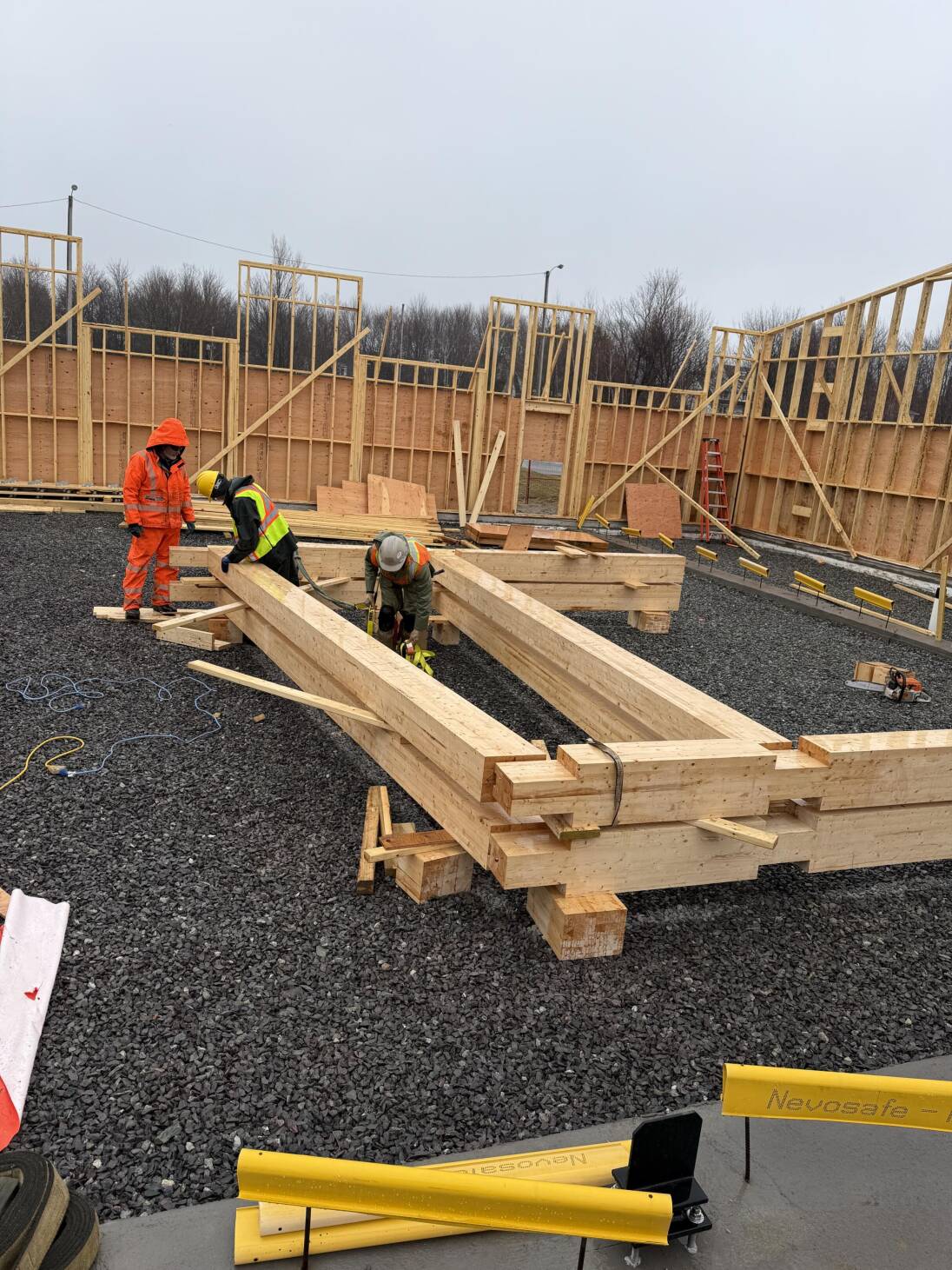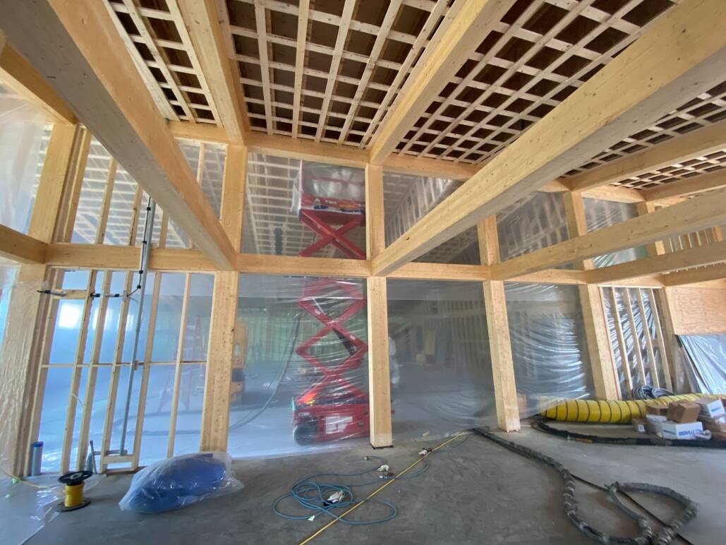 Ensuite, c’était au tour de l’installation de la charpente en bois massif, qui supporte à la fois une partie supérieure et une partie inférieure du toit, avec des fenêtres entre les deux. Le bois massif a été fourni par Nordic Structures, et Eastcut a fabriqué les composantes nécessaires.