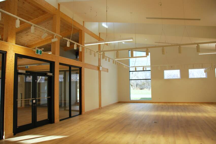 La structure de 560 mètres carrés, aujourd’hui achevée, est divisée en trois zones. Le côté nord, où se trouve la partie musée, est fait de panneaux de bois d’ingénierie de grande hauteur. Le côté sud, où sont situés les bureaux et les espaces communautaires supplémentaires, est une construction traditionnelle à ossature légère 2x6 avec un hall et un passage central en bois massif.