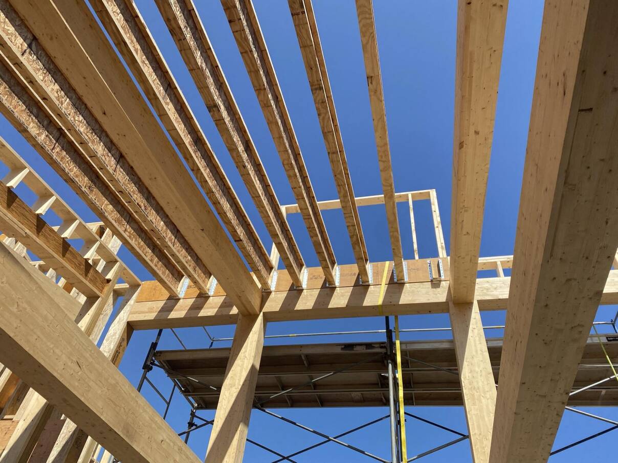 Combiner des composantes fabriquées hors site avec une construction à charpente à ossature légère en bois a nécessité une planification irréprochable pour assurer que tout serait installé dans le bon ordre. Photo fournie par EastCut.
