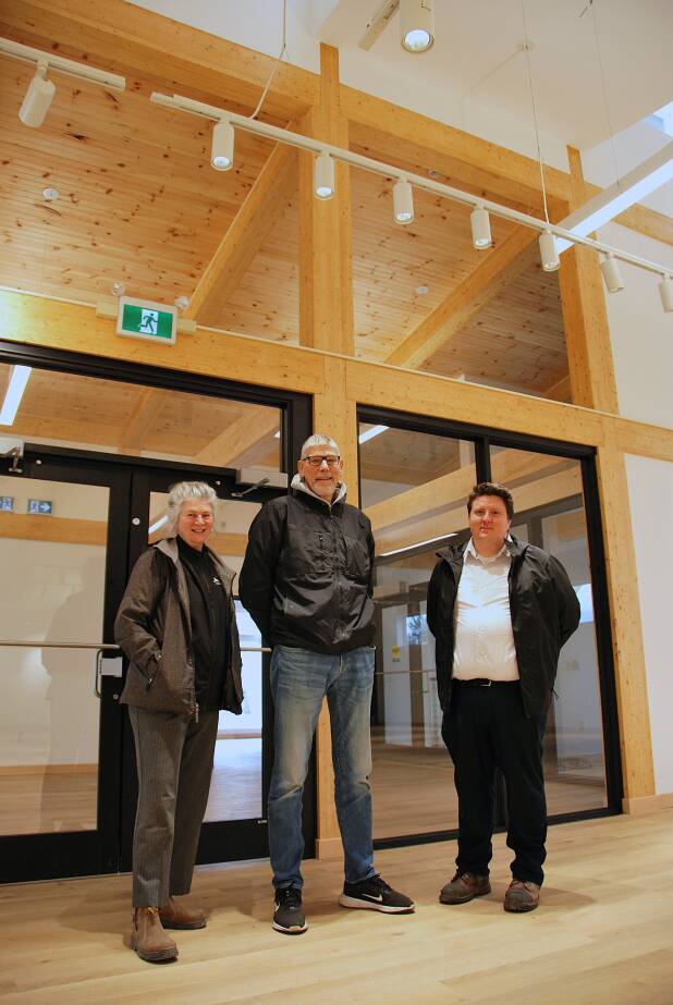 From left, Cynthia Thompson, senior communications and marketing consultant for EastCut, Peter vanKessel, chair of the building committee for the Pictou County Sports Heritage Hall of Fame, and John Spencer, structural designer with Eastcut. Photo by Maria Church.
