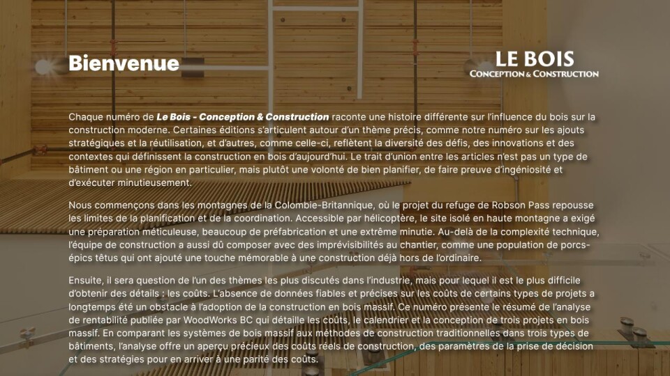 Chaque numéro de Le Bois - Conception & Construction raconte une histoire différente sur l’influence du bois sur la construction moderne. Certaines éditions s’articulent autour d’un thème précis, comme notre numéro sur les ajouts stratégiques et la réutilisation, et d’autres, comme celle-ci, reflètent la diversité des défis, des innovations et des contextes qui définissent la construction en bois d’aujourd’hui. Le trait d’union entre les articles n’est pas un type de bâtiment ou une région en particulier, mais plutôt une volonté de bien planifier, de faire preuve d’ingéniosité et d’exécuter minutieusement.