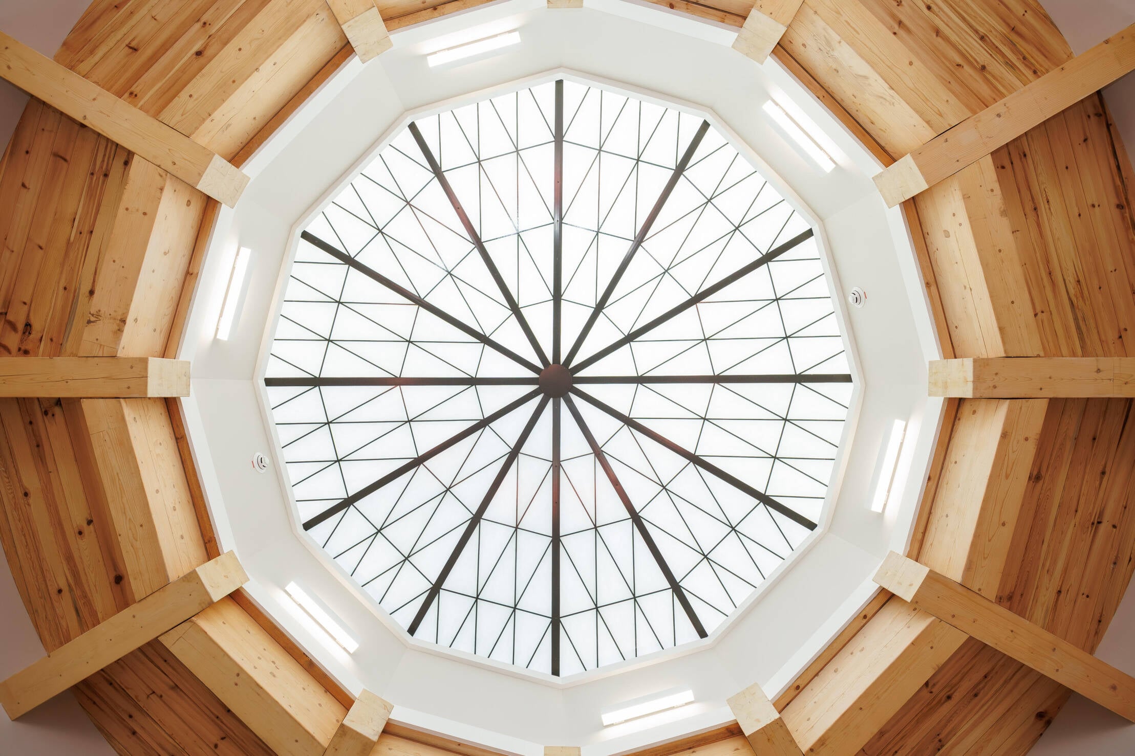 Le cœur du bâtiment comprend une toiture plate avec un platelage à rainure et languette soutenu par des poutres en bois lamellé-collé. Cette structure soutient et met en valeur le puits de lumière surélevé. La structure en bois est laissée apparente à l’intérieur, apportant une chaleur visuelle aux espaces communs, de repas et de guérison culturelle. Les patios couverts présentent également un platelage en bois apparent, offrant à la fois ombrage et protection contre les intempéries. Cette expression structurale se prolonge également au niveau de la marquise d’entrée.