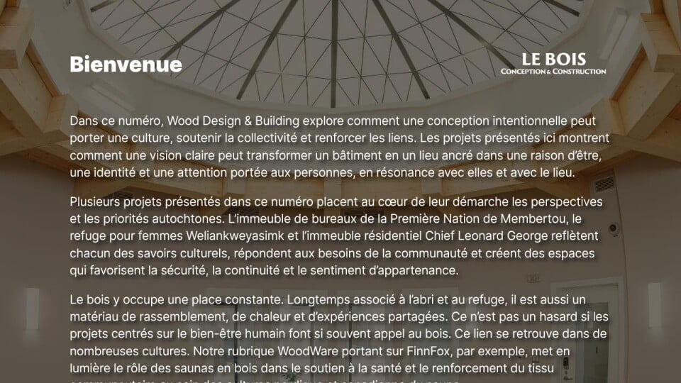 Dans ce numéro, Wood Design & Building explore comment une conception intentionnelle peut porter une culture, soutenir la collectivité et renforcer les liens. Les projets présentés ici montrent comment une vision claire peut transformer un bâtiment en un lieu ancré dans une raison d’être, une identité et une attention portée aux personnes, en résonance avec elles et avec le lieu.