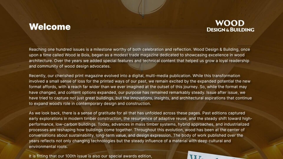 It is fitting that our 100th issue is also our special awards edition, honouring the winners of the 2025 Wood Design & Building Awards. These celebrated projects are the latest chapter in the architectural story we have been privileged to document for decades. What distinguishes them is not only their accomplishment today, but what they suggest about tomorrow: a more sustainable built environment defined by technical excellence, architectural warmth, and memorable experiences that transcend program or scale.