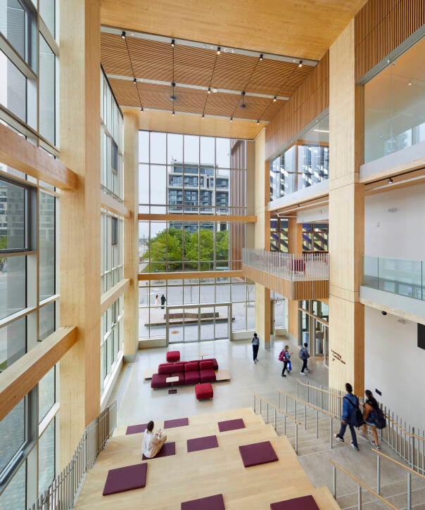 Home to the School of Architectural Technology, the Brookfield Sustainability Institute, Mary’s Place Child Care Centre, and additional learning spaces, Limberlost Place fosters an academic ecosystem rooted in innovation, inclusion, and sustainability. The beamless, long-span mass timber system allows for flexible interior layouts, enabling spaces to evolve as programs and technologies advance.