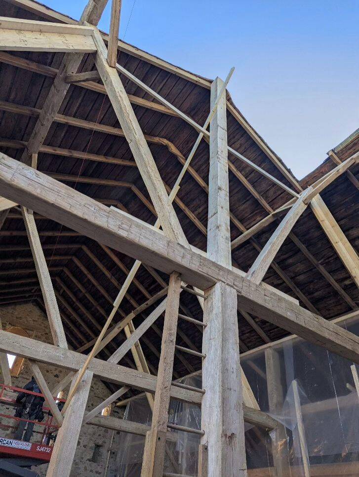 Visual grading and species identification were critical to informing Phase 2 of the project. On site, in situ grading confirmed the primary timber frames as elm. The balance of the 1890s framing—including the knee braces—was hemlock. New rafters were visually graded in situ to permit the use of locally sourced white pine. Tacoma Engineers assigned species- and grade-specific strength properties by applying ASTM D245, Standard Practice for Establishing Structural Grades and Related Allowable Properties for Visually Graded Lumber, and CSA O86-19, Engineering Design in Wood.