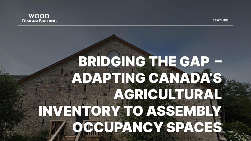 Extant barns — or barns without their original use or context — pepper the landscapes of much of Canada. The Pennsylvanian German slit barn and the quintessential Ontario bank barn were designed to harness animal heat, facilitate hay drying, contain animals, and provide a threshing floor. With the industrialization of farming, the design of these barns has changed to keep up with the needs and desired features of 21stcentury North American farming operations. As urban expansion into former farmland continues, these historic agricultural buildings are often considered for commercial opportunities such as agrotourism event spaces. Pursuing these conversions underscores the need to bridge the gap between heritage conservation objectives and code driven structural upgrades associated with a change-of-use application.