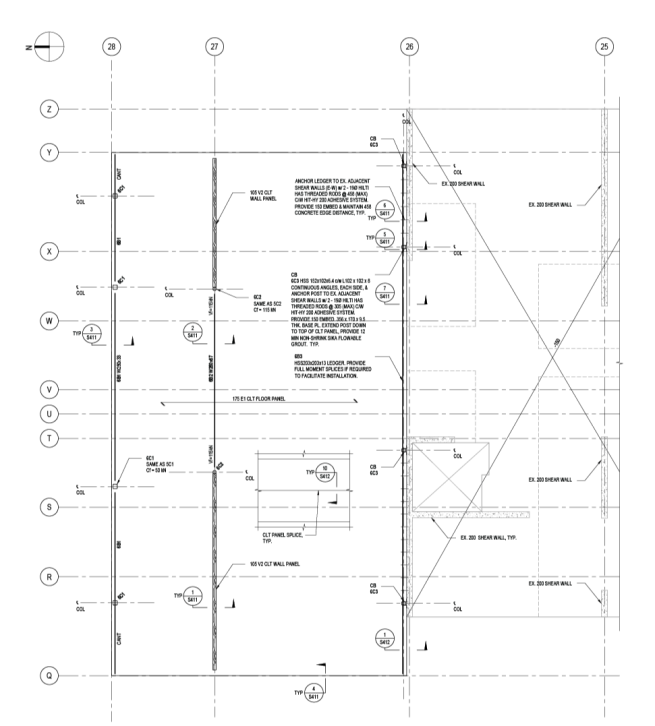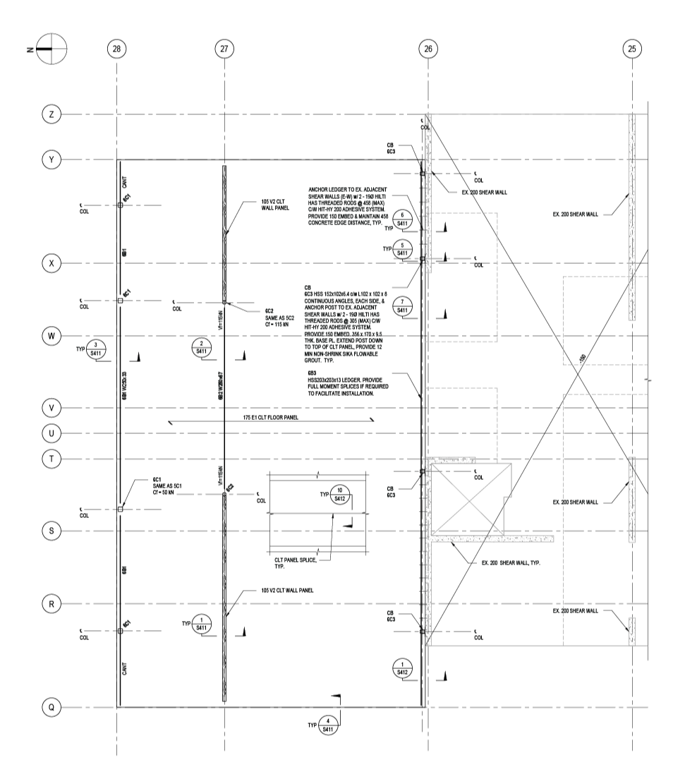 The existing building’s lateral system consists of concrete shear walls running in the building’s short direction. For the vertical addition, the CLT diaphragm is cantilevered beyond the last existing shear wall to reach the upper floors. A continuous HSS beam (ledger) and Hilti bolts are used to connect and anchor the new diaphragm to the existing shear wall.