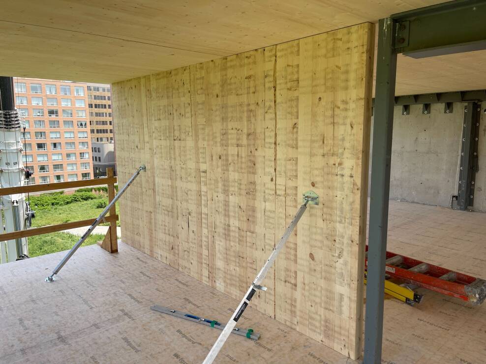 Mass timber panels were used for the central shear walls on both floors, the roof, and the sixth floor. Structural steel components were introduced to satisfy headroom and non-combustibility requirements. Tying the addition into the existing building both vertically and horizontally presented certain challenges, and the new construction had to be sprinklered in addition to the 5th and 6th floor corridors of the existing building.