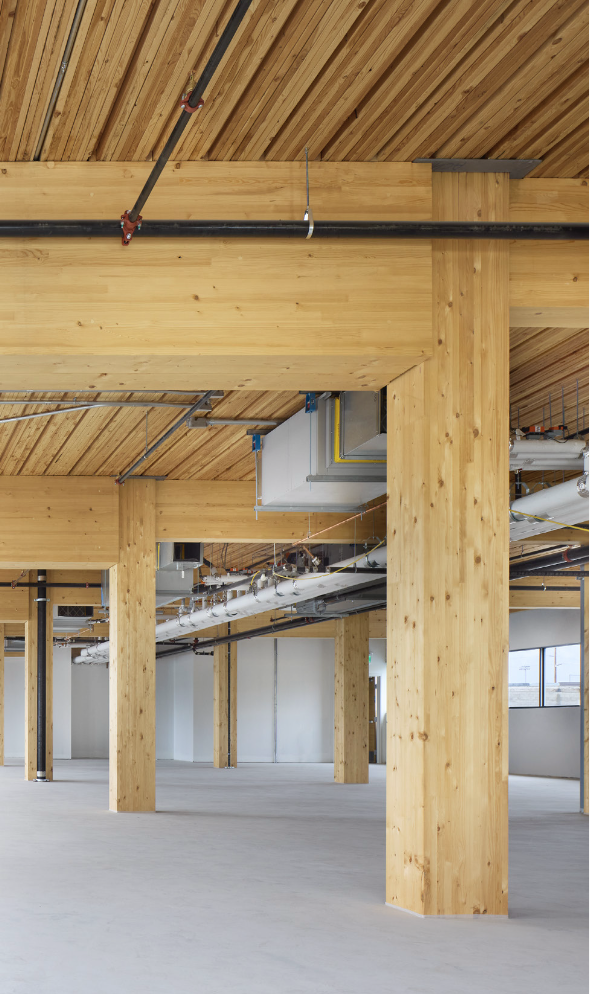 The team deployed strategic material sequencing to secure competitive insurance rates, by delaying on-site arrival of the mass timber following completion of the concrete work. Prefabricated curtain wall panels also compress the overall schedule. Strong municipal collaboration, strategic design revisions, and rigorous evaluation of suppliers allowed mass timber to be cost competitive in a high-rise context which is an important milestone for the industry.