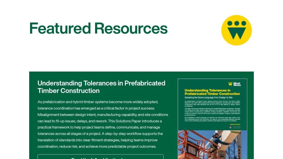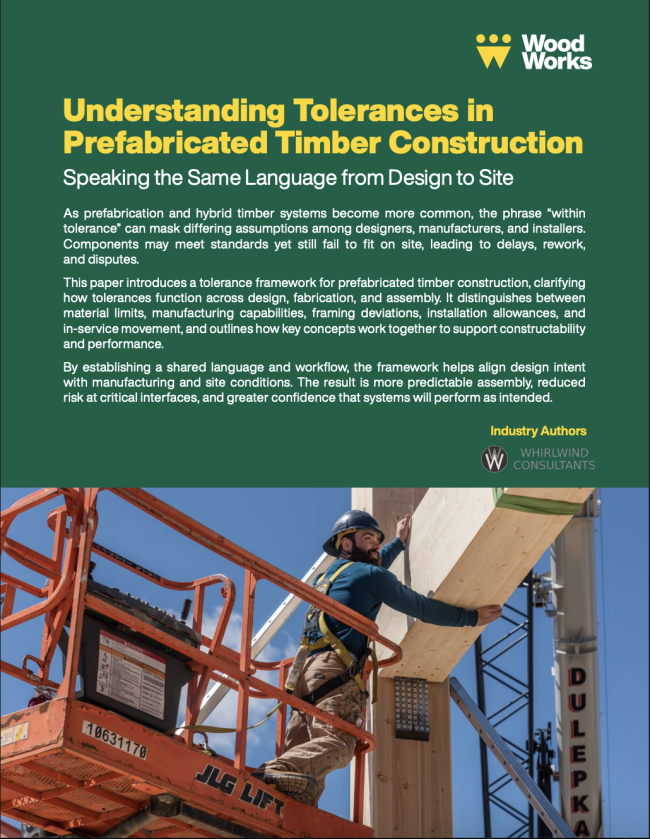 As prefabrication and hybrid timber systems become more widely adopted, tolerance coordination has emerged as a critical factor in project success. Misalignment between design intent, manufacturing capability, and site conditions can lead to fit-up issues, delays, and rework. This Solutions Paper introduces a practical framework to help project teams define, communicate, and manage tolerances across all stages of a project. A step-by-step workflow supports the translation of standards into clear fitment strategies, helping teams improve coordination, reduce risk, and achieve more predictable project outcomes.