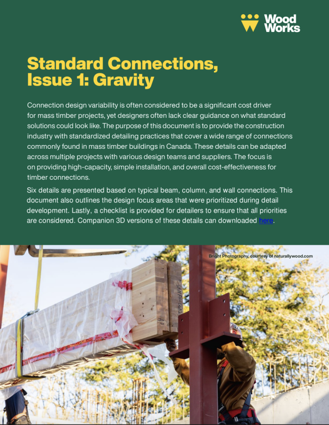 Connection design variability is often a significant cost driver in mass timber projects, yet designers often lack clear guidance on standard solutions. This document provides the construction industry with standardized detailing practices for a range of common mass timber connections in Canada. These details can be adapted across projects, design teams, and suppliers, with a focus on high capacity, ease of installation, and cost-effectiveness. Six details are presented based on typical beam, column, and wall connections, along with key design priorities and a checklist to help ensure they are addressed.