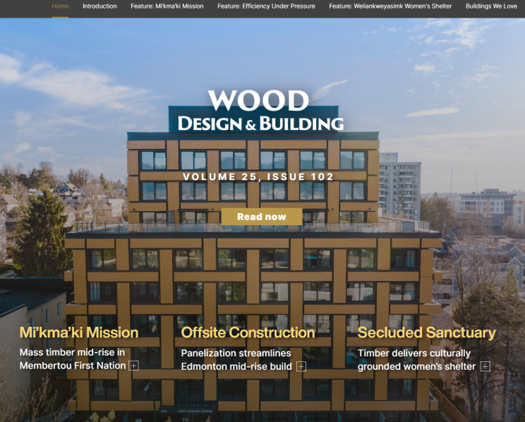Wood Design & Building magazine showcases the projects and ideas shaping wood construction across Canada and beyond. From leading-edge designs to practical advice, the magazine brings together the work and ideas driving the industry forward. In the latest issue, a curated selection of projects highlights how wood is being used to deliver not only structural performance, but also cultural, social, and community impact. Alongside these features, technical perspectives explore prefabrication, efficiency, and the evolving role of wood in a more productive and sustainable built environment. View the latest issue here and click here to subscribe and have the magazine delivered to your inbox for free 6x per year.